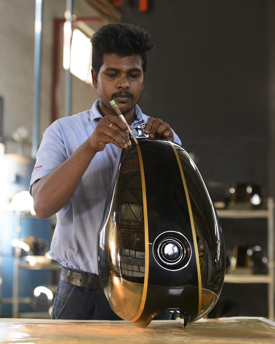 รอยัล เอ็นฟีลด์ฉลองครบรอบ 120 ปี อย่างภาคภูมิใจใน DNA ของแบรนด์ที่มีเอกลักษณ์ในด้านการผลิตรถจักรยานยนต์ทำมือ ด้วยสัญลักษณ์ รอยัล เอ็นฟิลด์ ด้านข้างถังน้ำมันที่ช่างทำขึ้นด้วยมือทั้งหมดจากทองเหลือง สัญลักษณ์ที่ดูวิจิตรนี้ทำขึ้นร่วมกับตระกูลเซอร์ปี เซนธิล (Sirpi Senthil) ซึ่งเป็นช่างฝีมือหลากหลายชั่วอายุคนจากเมืองวัด กุมภโกนัม (Kumbakonam), รัฐทมิฬนาฑู ประเทศอินเดีย ที่เชี่ยวชาญในการทำหุ่นจำลองทองเหลืองที่สง่างามให้กับวัดต่าง ๆ ที่ผู้คนเคารพ และนับถือมากที่สุดในประเทศอินเดียมานานหลายศตวรรษ โดยครั้งนี้เป็นครั้งแรกที่ช่างฝีมือเหล่านี้ร่วมมือกับแบรนด์ยานยนต์