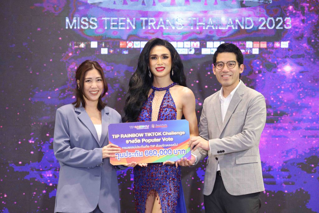 TIP Rainbow ประกันภัยที่เข้าใจความหลากหลาย โดย ทิพยประกันภัย ร่วมสนับสนุนการประกวด Miss Teen Trans Thailand ปีที่ 2 ซึ่งเวทีการประกวดนี้เป็นเวทีต้นแบบสำหรับเด็กและเยาวชนที่มีความหลากหลายทางเพศ หรือ LGBTQ+ ที่มีจิตอาสาและจิตสาธารณะ อีกทั้งยังช่วยส่งเสริมภาพลักษณ์ของเยาวชนและเป็นการสนับสนุนการสร้างเวทีให้แสดงศักยภาพอย่างเต็มที่อีกด้วย โดยบริษัทฯได้มอบแผนประกันภัย “TIP ด้วยรักตลอดไป” คุ้มครองอุบัติเหตุและภาวะโคม่าจากโรคร้ายแรง ให้กับผู้ได้รับตำแหน่ง Miss Teen Trans Thailand 2023 และมอบรางวัลพิเศษ TIP Rainbow TIKTOK Challenge รวม 3 รางวัล ทุนประกันรวม 1,980,000 บาท ณ คูณ โฮเทล สุขุมวิท