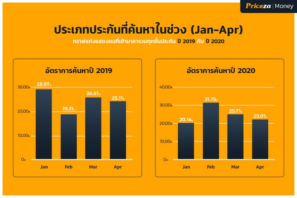 แน่นอนว่า จากปี 2019 ที่ผ่านมา ยอดการค้นหาประกันรถยนต์ ในเดือนมกราคม อยู่ที่ 28.97 % ขณะที่ปี 2020 ลดลงที่ 20.14% พอก้าวสู่เดือนกุมภาพันธ์ น่าจะเป็นช่วงที่รถยนต์หลายคันหมดประกันช่วงเดือนนี้กันเยอะ ปี 2019 อยู่ที่ 19.31% ส่วนปี 2020 ยอดค้นหาดีดตัวขึ้นสูงเป็น 31.15% และช่วงนั้น ยังเป็นช่วงที่โควิดในไทยยังไม่แพร่ระบาด แต่พอถึงช่วงเดือนมีนาคมเป็นต้นไป ชัดเจนเลยว่า โควิดเริ่มมา ยอดการค้นหาเริ่มลดลง โดยปี 2019 อยู่ที่ 26.61% ส่วนปี 2020 เหลือ 25.71% จนเดือนเมษายน ก็ลดลงอีก จาก 25.11% เป็น 23.01% นั่นเป็นเพราะ ทุกคนเริ่มคุมค่าใช้จ่ายมากขึ้น เมื่อต้องทำงานอยู่บ้าน ไม่ได้ออกไปไหน การค้นหาประกันรถยนต์ก็ลดน้อยลงตามลำดับ